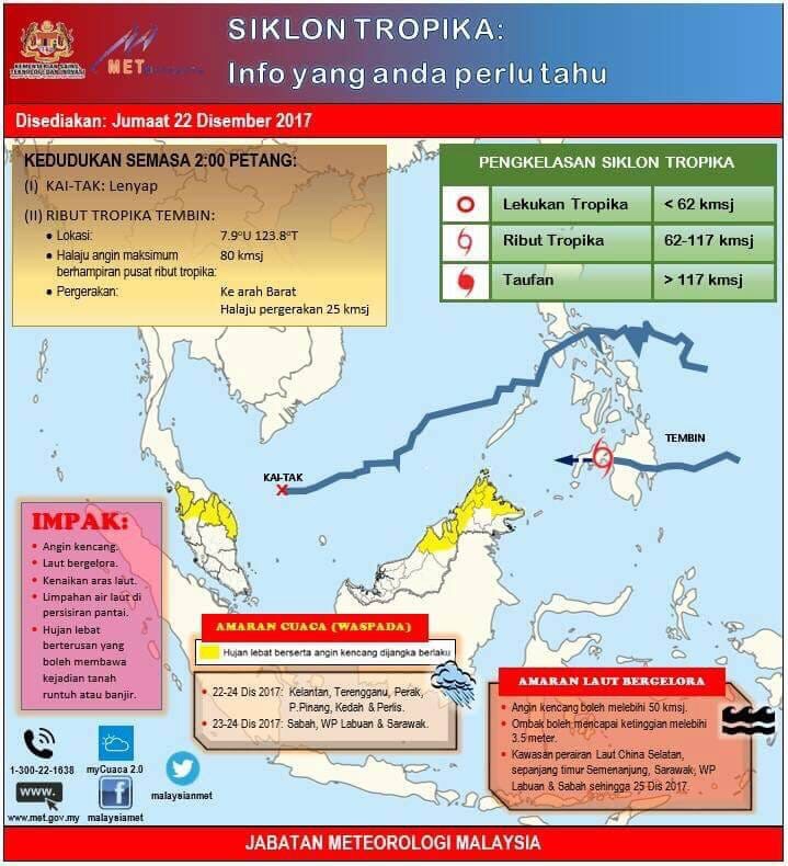 According to MetMalaysia, tropical storm Kai Tak getting weak and disappear in the South China Sea. However, dangerous Typhoon Tembin going to pass through East Malaysia on Saturday. For details, kindly check the Facebook Fanpage of MetMalaysia or their website.