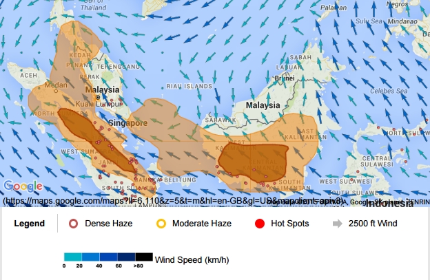 Yesterday ASMC satellite detected haze data showed that the transboudary haze from Kalimantan already reached Singapore, where the pollutant source is not from the Sumatra alone. ASMC data on 22 October showed the haze from Kalimantan has reached East Coast of Peninsular Malaysia. Luckily, we are also observing the changes of the Southwest monsoon wind to Northeast monsoon wind pattern. Within a few days, the thick haze of Kalimantan and Sumatra will be dispersed towards the Southern area.